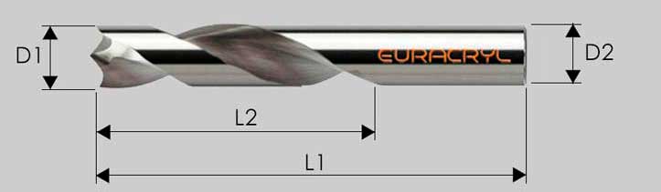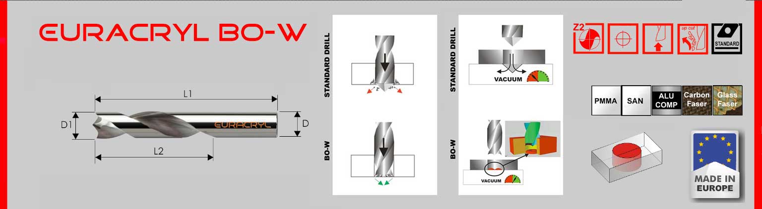 Brocas de metal duro en calidad estándar con protección contra desgarramiento de borde de salida y protección contra pérdida de vacío cuando se utiliza mesa de vacío. Para el procesamiento de metacrilato (PMMA), policarbonato y otros plásticos brillantes o transparentes.