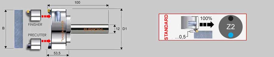 Cabeza frontal con cuchillas de intercambio rápido de diamante mono o policristalino para alto brillo, brillo estándar, superficies satinadas, superficies para encolar, etc. Para el procesamiento de metacrilato (PMMA), policarbonato y otros plásticos brillantes o transparentes, así como materiales mixtos (PMMA + papel, PMMA + aluminio, etc.) y metales no térreos. Aplicación en portaherramientas de pinzas.
