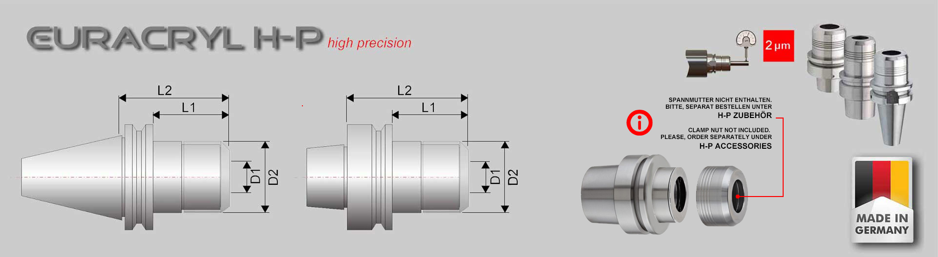 Portaherramientas de pinzas de precisión para todas las fresadoras CNC. Especialmente adecuado para el procesamiento de plásticos transparentes y brillantes en conjunto con pinzas de precisión H-P de alta precisión.