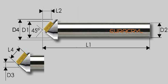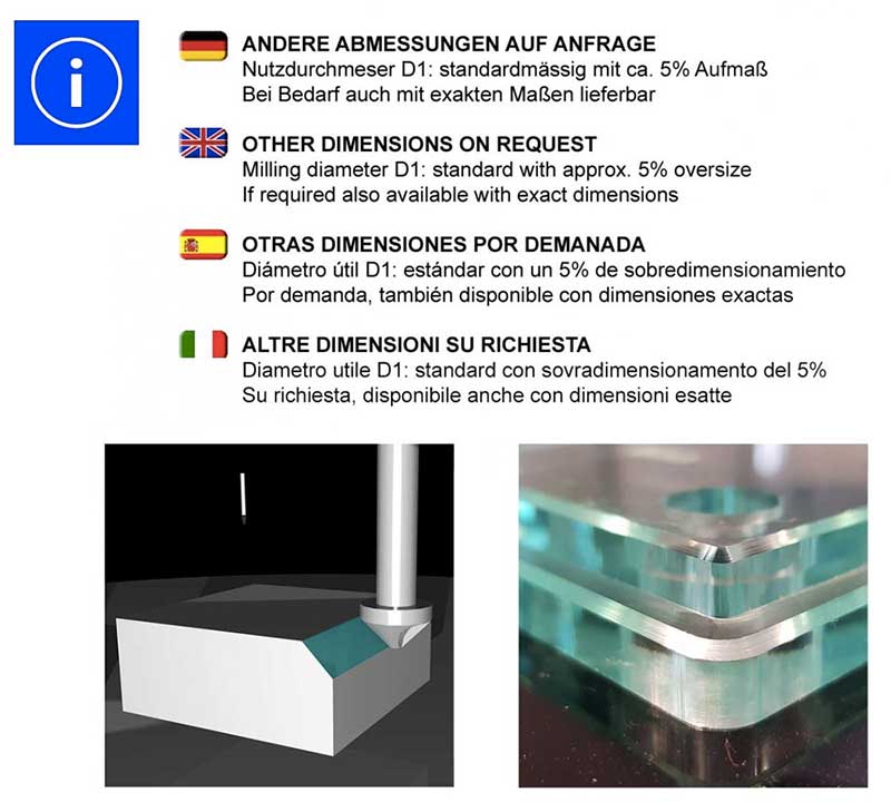 Fresas de chaflán con cuchilla de diamante monocristalino para el procesamiento de alto brillo de metacrilato (PMMA), policarbonato y otros plásticos brillantes o transparentes, así como metales no férreos. Para el mecanizado de biseles y facetas.