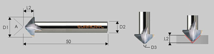 Fresa de metal duro para el trabajo de plegado en materiales compuestos de aluminio. Filo de corte espiralizado a la derecha con expulsión de viruta hacia arriba.