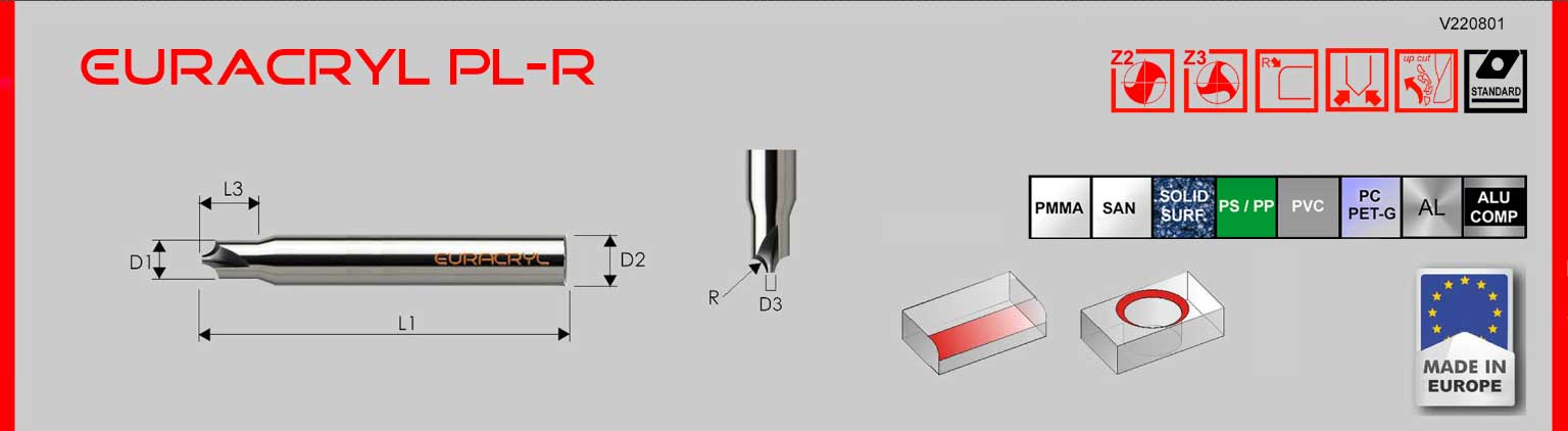 Fresa de mango de metal duro en calidad estándar para redondear el borde superior del material. Para el procesamiento de metacrilato (PMMA), policarbonato y otros plásticos brillantes o transparentes, así como metales ligeros. Herramienta de desbaste. Filo de corte recto.