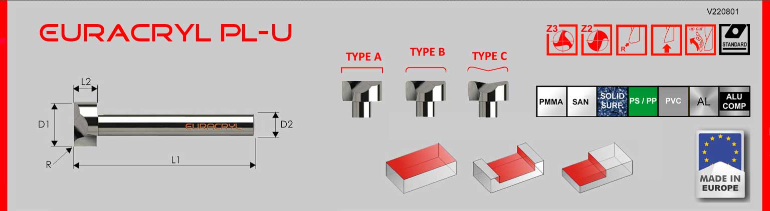 Fresas de mango metal duro en calidad estándar con o sin puntas redondeadas. Para procesar metacrilato (PMMA), policarbonato y otros plásticos brillantes o transparentes, así como metales ligeros. Para el procesamiento de superficies horizontales. Herramienta de desbaste. Filo de corte espiralizado a la derecha con expulsión de viruta hacia arriba.