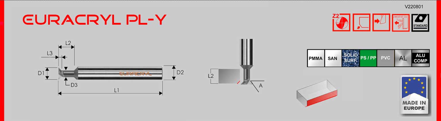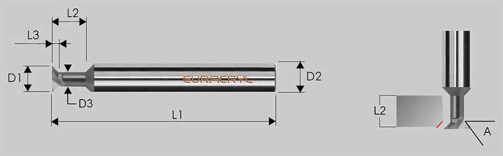 Fresa de mango de metal duro de calidad estándar para biselar el borde inferior del material. Para el procesamiento de metacrilato (PMMA), policarbonato y otros plásticos brillantes o transparentes, así como metales ligeros. Herramienta de desbaste. Filo de corte recto.