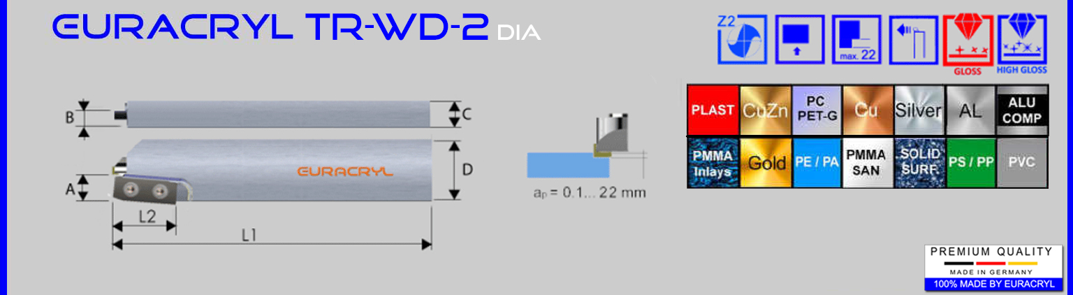 Herramientas de torneado exterior de dos etapas con cuchilla de acabado de diamante mono o policristalino y plaquita indexable de gran volumen. Para ALTO BRILLO o brillo estándar. Para procesar metacrilato (PMMA) y otros plásticos. Para torneado longitudinal con profundidades de torneado extremas.