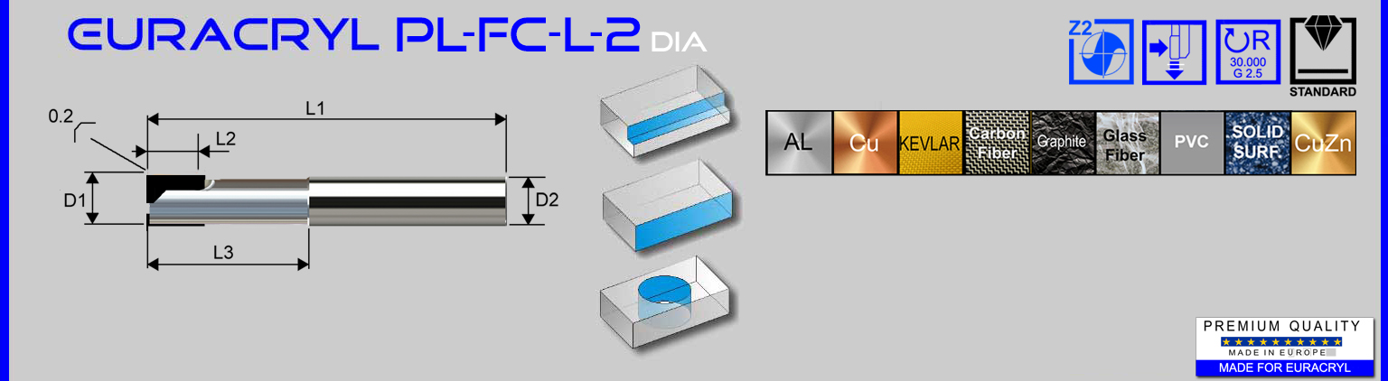 Fresa con 2 filos diamante policristalino para el mecanizado de plástico reforzado de fibra de vidrio (PRFV), plástico reforzado con fibra de carbono (CFRP), grafito, superficie sólida (CORIAN, etc.), aluminio, etc. Para superficies interiores y exteriores.