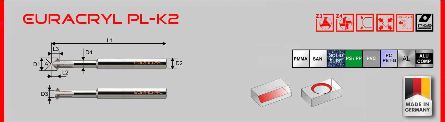 Herramienta de rebabas hacia delante y hacia atrás. Para procesar acrílico (PMMA), policarbonato y otros plásticos, así como metales ligeros. Filo de corte recto.