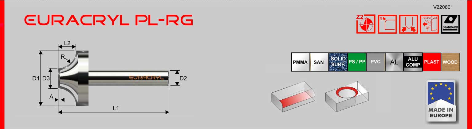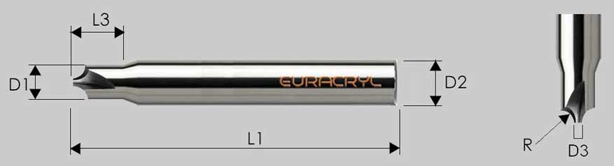 Fresa de radio de metal duro con mango de acero en calidad estándar para redondear el borde superior del material. Para procesar acrílico (PMMA), policarbonato y otros plásticos, así como madera. Borde de corte recto.