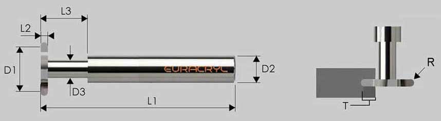 Fresa de disco de metal duro redondeado con mango de acero. Para el ranurado. Para procesar acrílico (PMMA) y otros plásticos, así como madera. Filo de corte recto.